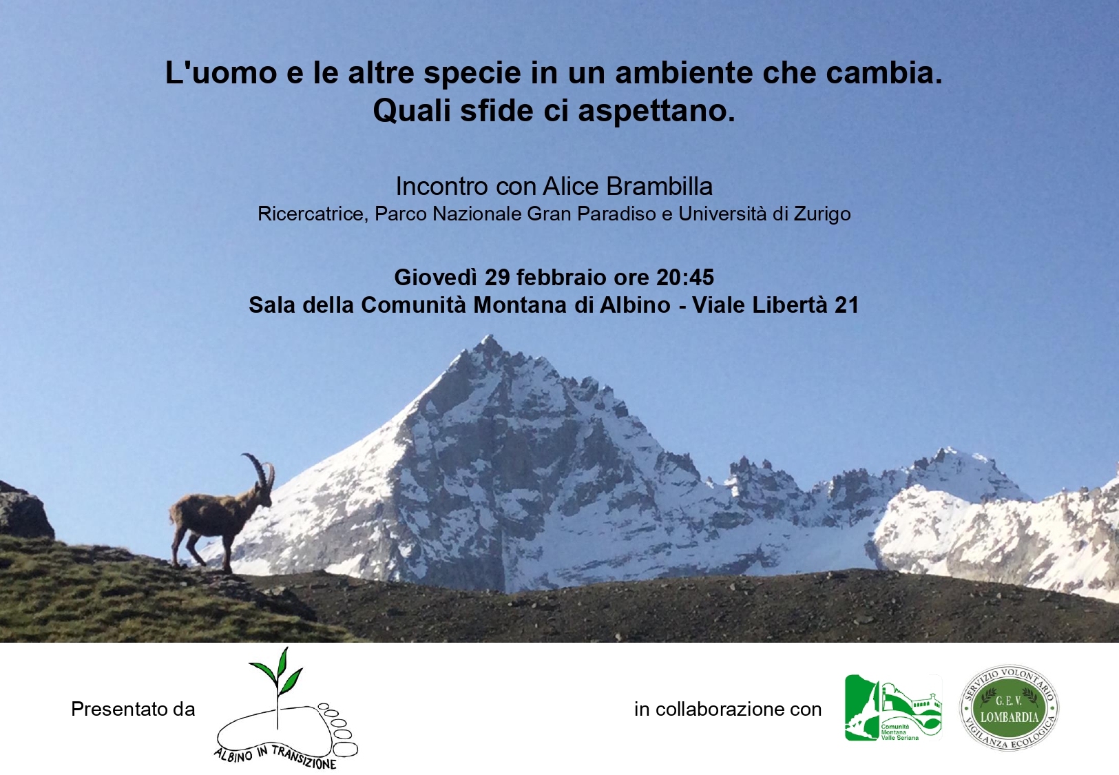 Grazie alla presenza di Alice Brambilla, ricercatrice presso l'Università di Zurigo che collabora con il Parco Nazionale Gran Paradiso, verranno illustrati alcuni esempi degli effetti che le mutazioni dell'ambiente hanno sulle specie selvatiche, al fine di comprendere la complessità del fenomeno e di capire dove si posiziona la specie umana in questo quadro.
