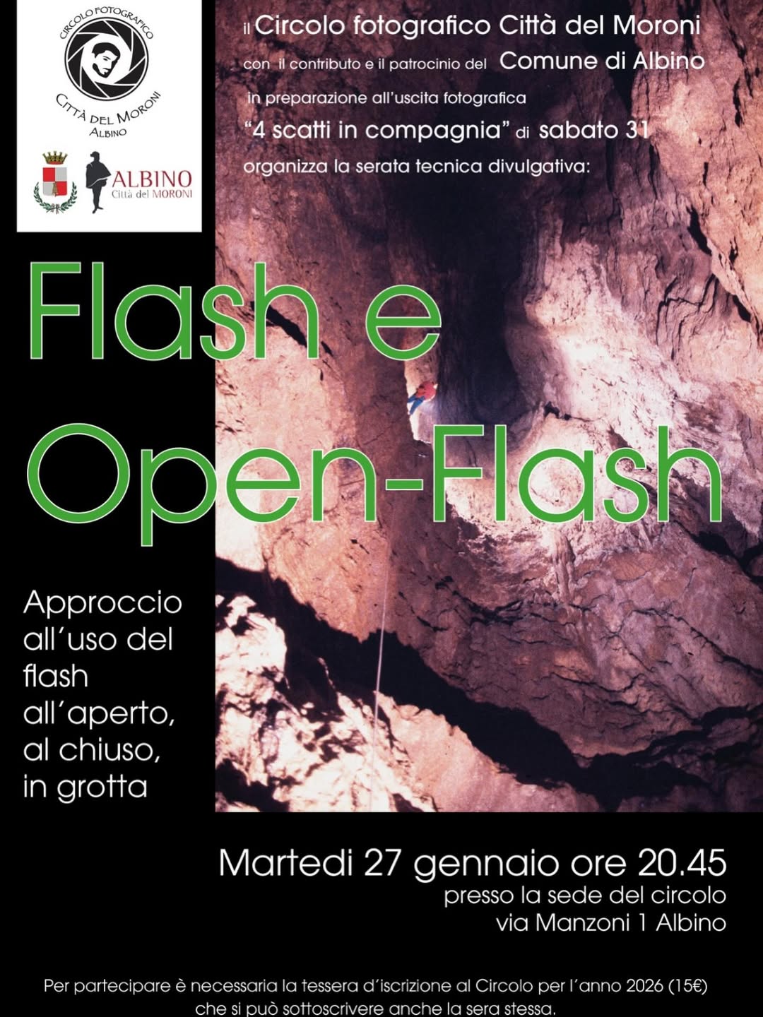 Martedì 27 gennaio alle 20.45, ad Albino, presso la sede del Circolo fotografico Città del Moroni, è in programma la serata tecnica divulgativa "Flash e Open-flash": approccio all'uso del flash all'aperto, al chiuso, in grotta.