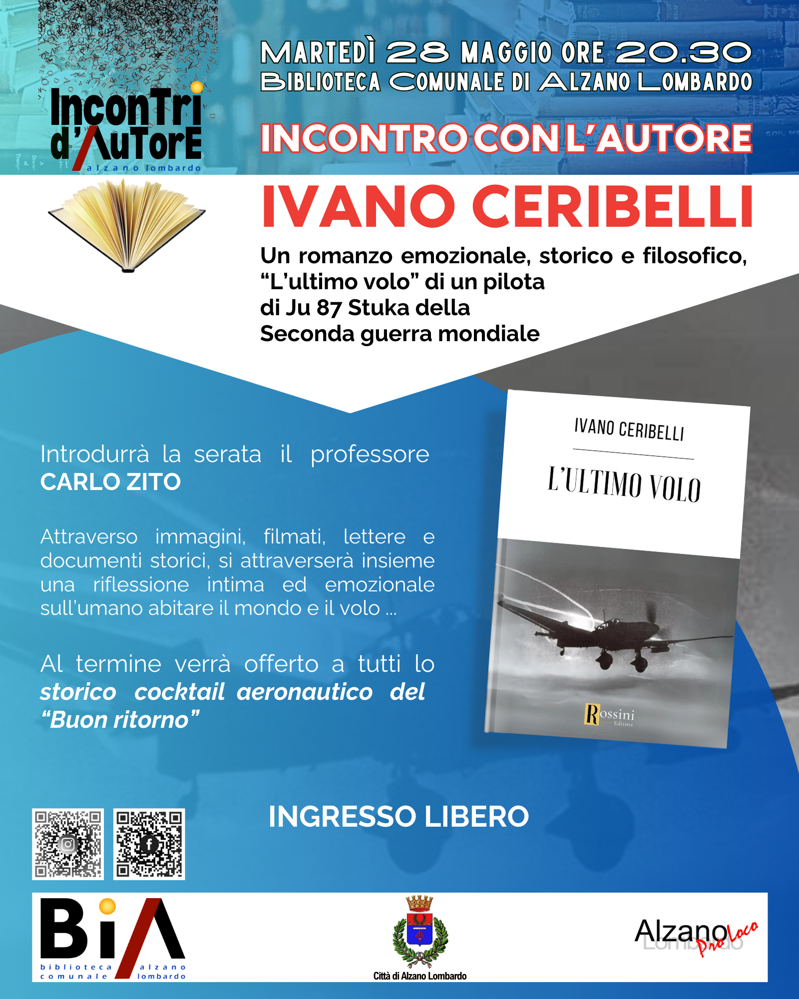 Martedì 28 maggio 2024 alle ore 20.30 presso la Biblioteca di Alzano Lombardo (Parco Montecchio) si terrà un incontro con Ivano Ceribelli, filosofo e scrittore, a seguito della pubblicazione del suo nuovo libro “L’ultimo volo” edito da Rossini Edizioni Milano (Gruppo Santelli).