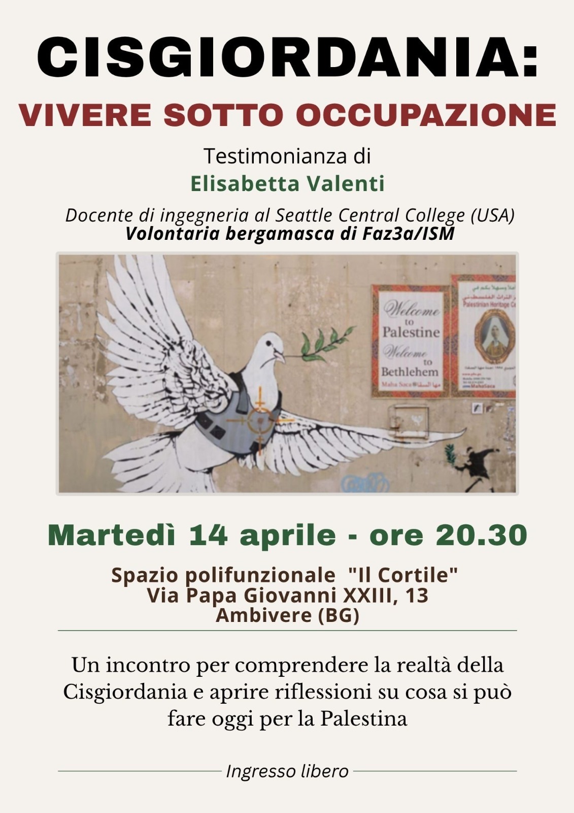 Si terrร martedรฌ 14 aprile alle 20.30, presso lO SPAZIO polifunzionale "Il cortile" di Ambivere, in via Papa Giovanni XXIII, 13, con la partecipazione e la testimonianza della dottoressa Elisabetta Valenti, che racconterร della esperienza in terra palestinese.