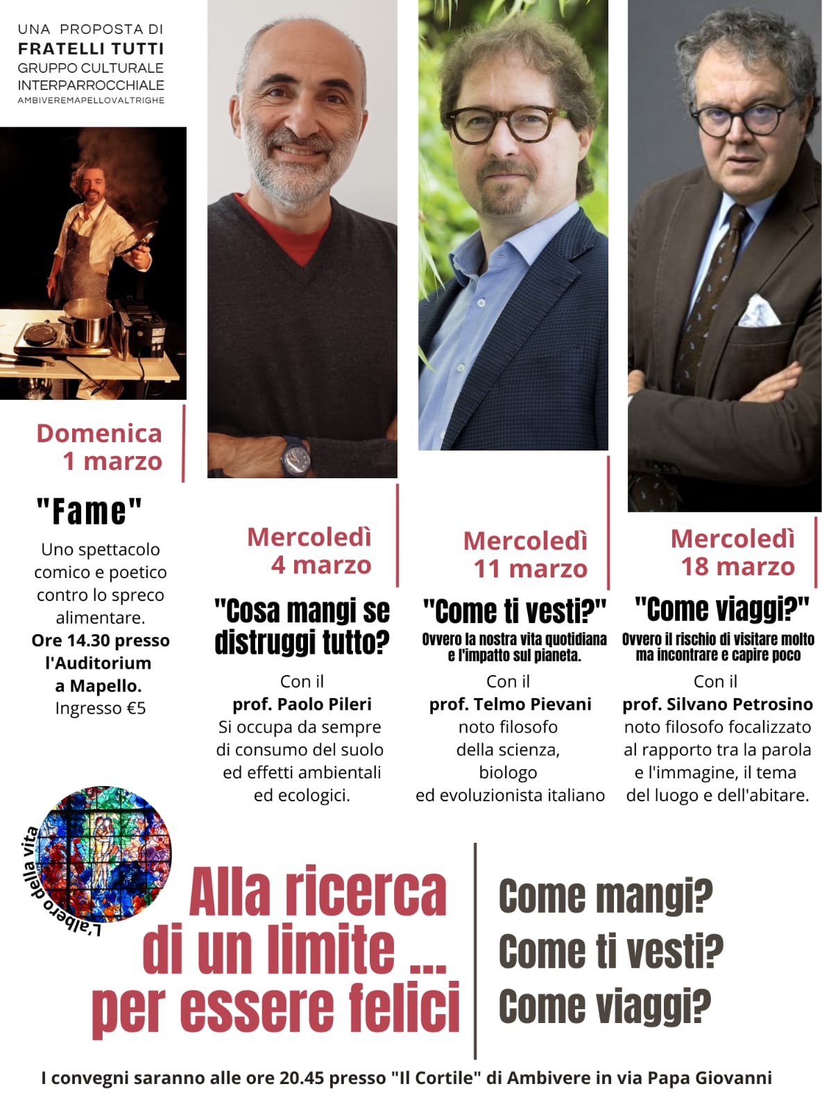 Fratelli tutti, Gruppo Culturale Interparrocchiale di Ambivere, Mapello, Valtrighe, organizza una serie di iniziative e convegni durante il periodo quaresimale, pensati e sviluppati attorno al tema «Alla ricerca di un limite... per essere felici».