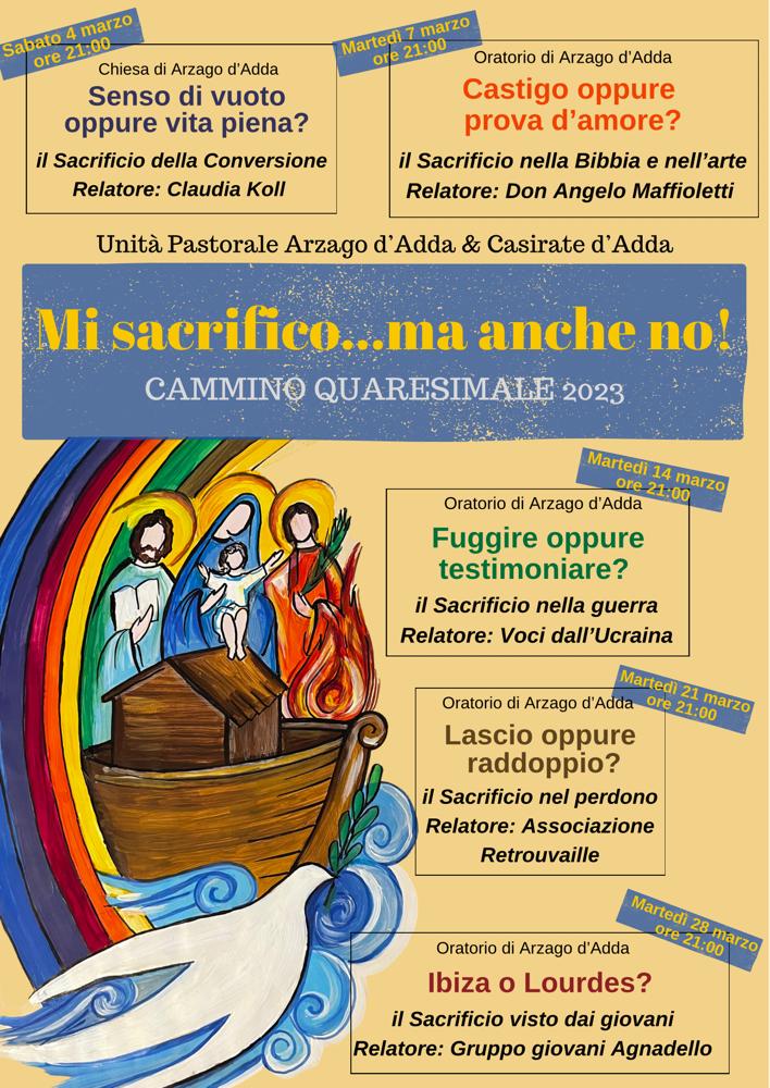 L'incontro apre un programma di incontri quaresimali sul tema del sacrificio, declinato in alcuni aspetti dell'esperienza umana, grazie a testimoni provenienti da ambiti diversi . Nato da un'idea di don Matteo Pini, parroco dell'unità pastorale di Arzago e Casirate d'Adda e sviluppato nella piena collaborazione tra i due paesi, Il ciclo si aprirà sabato 4 marzo, per proseguire nei martedì successivi sino al 28 marzo.