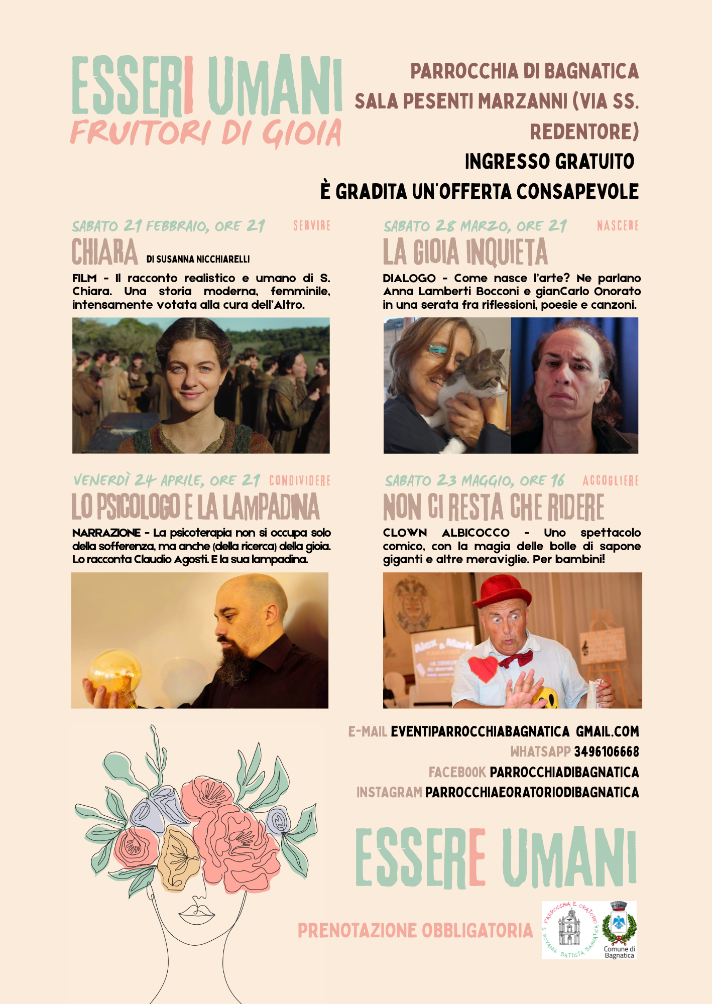 Per la rassegna di eventi «Esseri Umani. Essere Umani. Fruitori di Gioia» della Parrocchia di Bagnatica dedicata al tema della gioia, è in programma un monologo dello psicoterapeuta Claudio Agosti, sul tema della psicoterapia come ricerca di gioia.