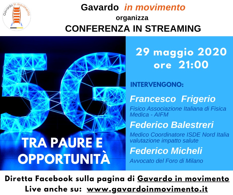 Sulla pagina Facebook di Gavardo in movimento si terrà una conferenza in streaming aperta a tutti inerente la tecnologia 5G che tanto sta facendo discutere.