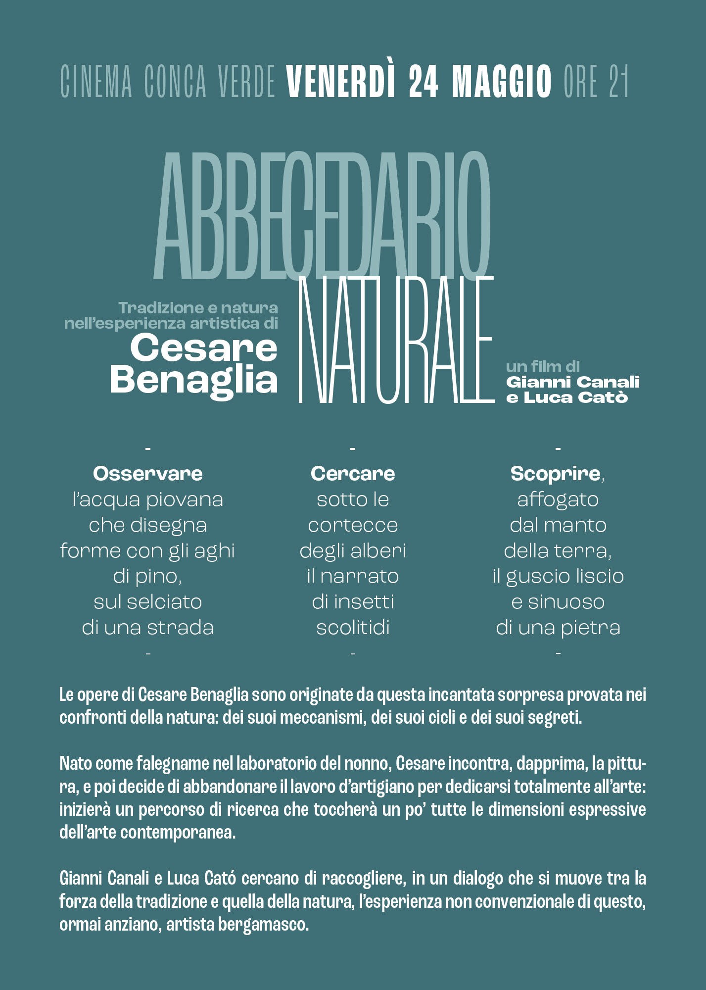 Venerdí 24 maggio verrà proiettato presso il Cinema Conca Verde di Bergamo, il film documentario "Abbecedario Naturale“ di Gianni Canali e Luca Catò dedicato alla figura dell’artista Cesare Benaglia.