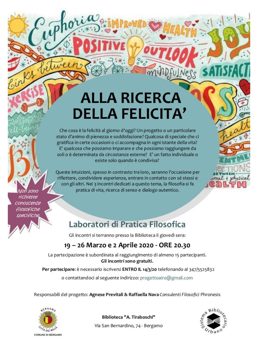 Laboratorio di pratica filosofica per riflettere, condividere esperienze ed entrare in contatto con sé stessi e con gli altri affrontando il tema della felicità, grazie al dialogo filosofico che si fa pratica di vita e ricerca di senso.