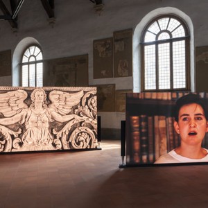 Il dialogo tra Sonia Boyce e gli studenti molto rivela del processo che ha portato alla realizzazione di Benevolence, composta da sei “monumenti visivi” che occupano la Sala delle Capriate di Palazzo della Ragione. La video installazione, nata da una performance trasformata in un film, è stata generata dalla mediazione autoriale del materiale video e fotografico girato durante le riprese.