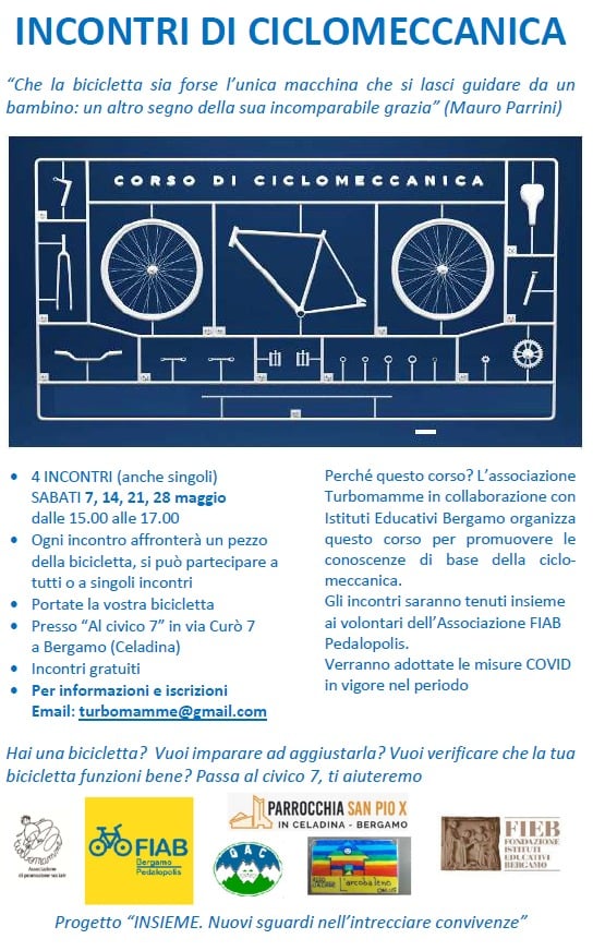 L'associazione turbomamme in collaborazione con istituti educativi Bergamo organizza questo corso per promuovere la conoscenza di base della ciclo-meccanica. Gli incontri si terranno insieme ai volontari dell'associazione FIAB.