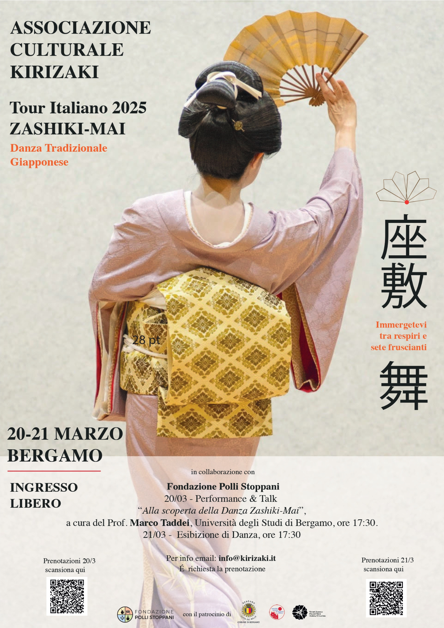 La magia e l’eleganza della danza tradizionale giapponese arrivano a Bergamo con due straordinari eventi organizzati dall’Associazione Culturale Kirizaki presso la Fondazione Polli Stoppani. Il pubblico avrà l’opportunità di immergersi nella delicatezza della Zashiki-mai, una forma d’arte che affonda le sue radici nel periodo Edo (1603-1868), caratterizzata da movimenti raffinati e atmosfere suggestive.