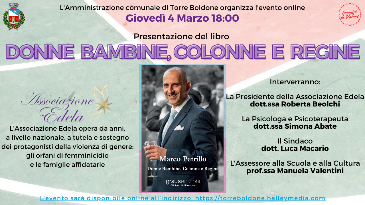 L'Amministrazione di Torre Boldone, insieme a Associazione Edela, ospita Marco Petrillo che presenterà il suo libro "Donne bambine, colonne e bambine".
