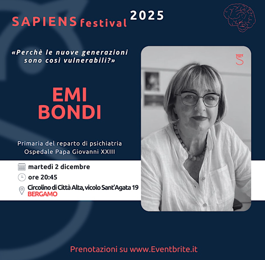 Nell'ambito del «Sapiens Festival », vi invitiamo a un incontro di profonda attualità e riflessione con la Dott.ssa Emi Bondi, primaria del reparto psichiatrico dell'Ospedale Papa Giovanni XXIII di Bergamo.