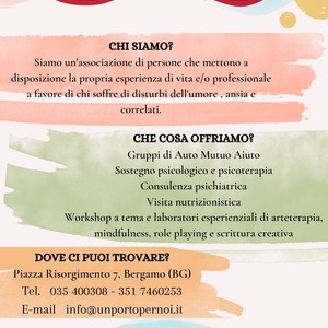 In occasione della giornata Europea sulla Depressione, l'Associazione Un Porto per Noi di Bergamo, che da anni si occupa di seguire le persone che soffrono di disturbi dell'umore, organizza presso la propria Sede in Piazzale Risorgimento 7, un pomeriggio dedicato all'informazione sui servizi offerti!