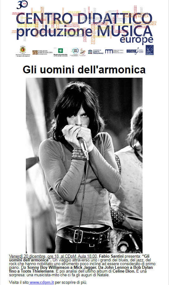 Fabio Santini presenta un viaggio attraverso i grandi del blues, del jazz, del rock che hanno nobilitato uno strumento poco incline ad essere considerato di primo piano. Da Sonny Boy Williamson a Mick Jagger. Da John Lennon a Bob Dylan fino a Toots Thielemans. E poi analisi dell’ultimo album di Celine Dion. E una sorpresa: una musicista-mito che ci fa gli auguri di Natale.