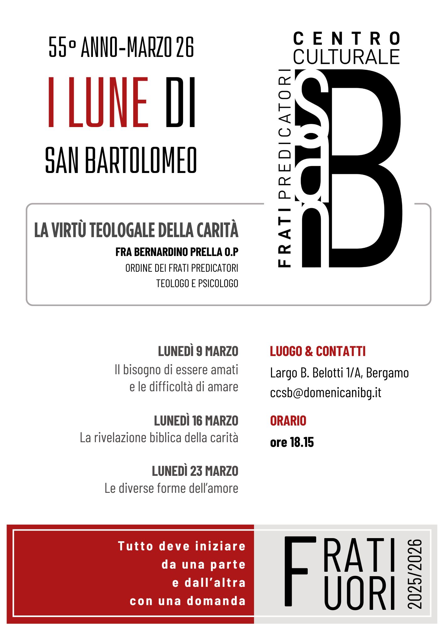 Tra psicologia e teologia il noto teologo e psicologo fra Bernardino Prella conduce gli ascoltatori alla conoscenza delle virtรน teologali. Dopo fede e speranza, nel mese di marzo sarร il tempo della Caritร . Si parte con il tema del bisogno di essere amati e della difficoltร di amare.