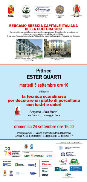 Nello spazio espositivo alla Sala Manzù della Provincia di Bergamo - passaggio Gennaro Sora - dove si può ammirare l’esposizione collettiva di pittura, acquerello, scultura e fotografia ispirata al tema: Le acque che uniscono le province di Bergamo e di Brescia: lago Sebino e fiume Oglio, la pittrice e ceramista Ester Quarti illustrerà con una dimostrazione la tecnica scandinava per decorare un piatto di porcellana con lustri rilievi e colori. L’incontro con la pittrice che rientra nelle iniziative organizzate dal Circolo Artistico Bergamasco ETS, dal Circolo Culturale Greppi e dall’associazione il Maestrale di Palazzolo sull’Oglio per il palinsesto Bergamo/Brescia capitale della cultura, è liberamente aperto al pubblico.