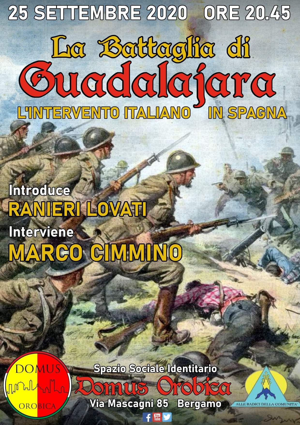 La battaglia di Guadalajara è certamente il capitolo più famoso e discusso nel racconto della partecipazione del Corpo Truppe Volontarie (C.T.V.) alla guerra civile spagnola. Con il passare del tempo lo scontro è esondato dall’alveo della storia per invadere il campo della leggenda. Quando l’eco della battaglia si alza nei cieli di Castiglia, tuttavia, l’impegno militare del regime al fianco dei nazionalisti è solo all’inizio e le operazioni belliche dureranno altri due anni prima di esaurirsi. Il sipario resterà alzato ancora a lungo su questo anticipo di guerra mondiale. Ma cosa fu davvero Guadalajara? Un disastro irreparabile o soltanto una battuta d’arresto? Come si comportarono i regolari italiani durante il corso del conflitto? E quali furono le caratteristiche peculiari del loro intervento? A queste e ad altre domande cerca di rispondere, per Domus Orobica, il professor Marco Cimmino.