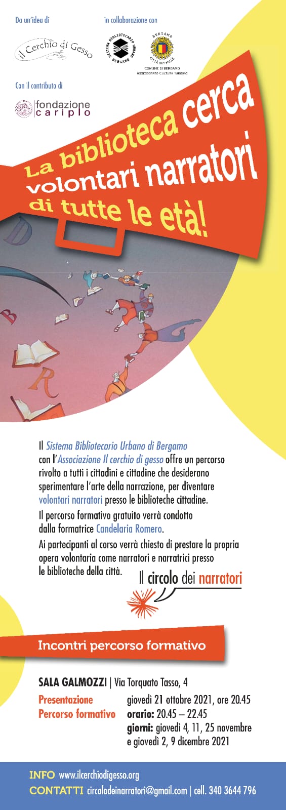 Presentazione del percorso formativo condotto da Candelaria Romero per cittadini/e che desiderano sperimentare l’arte della narrazione e della lettura ad alta voce. Dopo il corso, i nuovi volontari/e sceglieranno “Il circolo dei narratori“ della biblioteca in cui operare come nuovi narratori e narratrici nelle biblioteche del Sistema Bibliotecario Urbano del Comune di Bergamo.