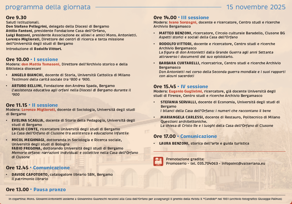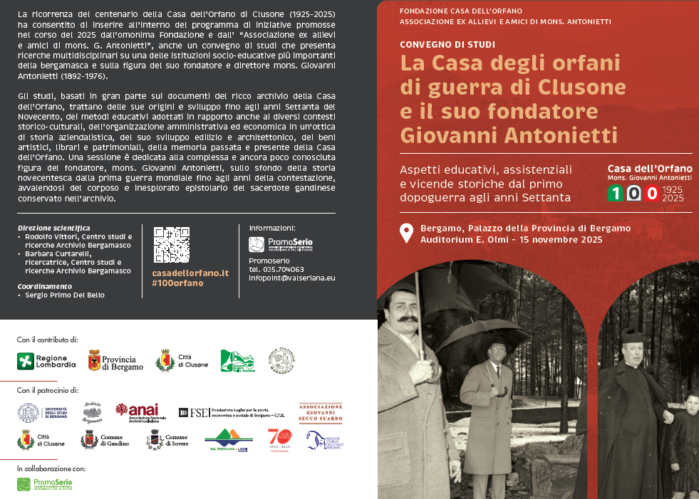 A segnare uno dei momenti più significativi del programma sarà il Convegno di Studi “La Casa degli orfani di guerra di Clusone e il suo fondatore Giovanni Antonietti. Aspetti educativi, assistenziali e vicende storiche dal primo dopoguerra agli anni Settanta”, in programma all’Auditorium Ermanno Olmi di Palazzo della Provincia.