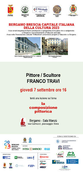Nellโambito del programma di iniziative organizzate dal Circolo Artistico Bergamasco ETS, dal Circolo Culturale Greppi e dallโassociazione il Maestrale Aps di Palazzolo sullโOglio, per lโitinerario che comprende il palinsesto Bergamo-Brescia capitale italiana della cultura, nello spazio espositivo della Sala Manzรน a Bergamo, via Camozzi/passaggio Sora dove si puรฒ ammirare lโesposizione collettiva di pittura, acquerello, scultura e fotografia ispirata al tema: Le acque che uniscono le province di Bergamo e di Brescia: lago Sebino e fiume Oglio, il pittore e scultore Franco Travi terrร una lezione su: La composizione pittorica. La lezione artistica รจ liberamente aperta al pubblico.