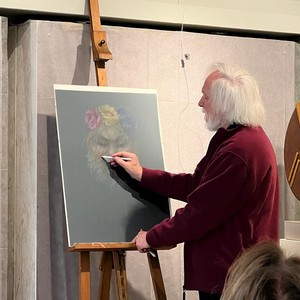 Nella Sala Manzรน, dove si puรฒ ammirare l'esposizione collettiva di pittura, acquerello, scultura e fotografia "Le acque che uniscono le province di Bergamo e di Brescia: lago Sebino e fiume Oglio", incontro con il pittore e scultore Franco Travi.