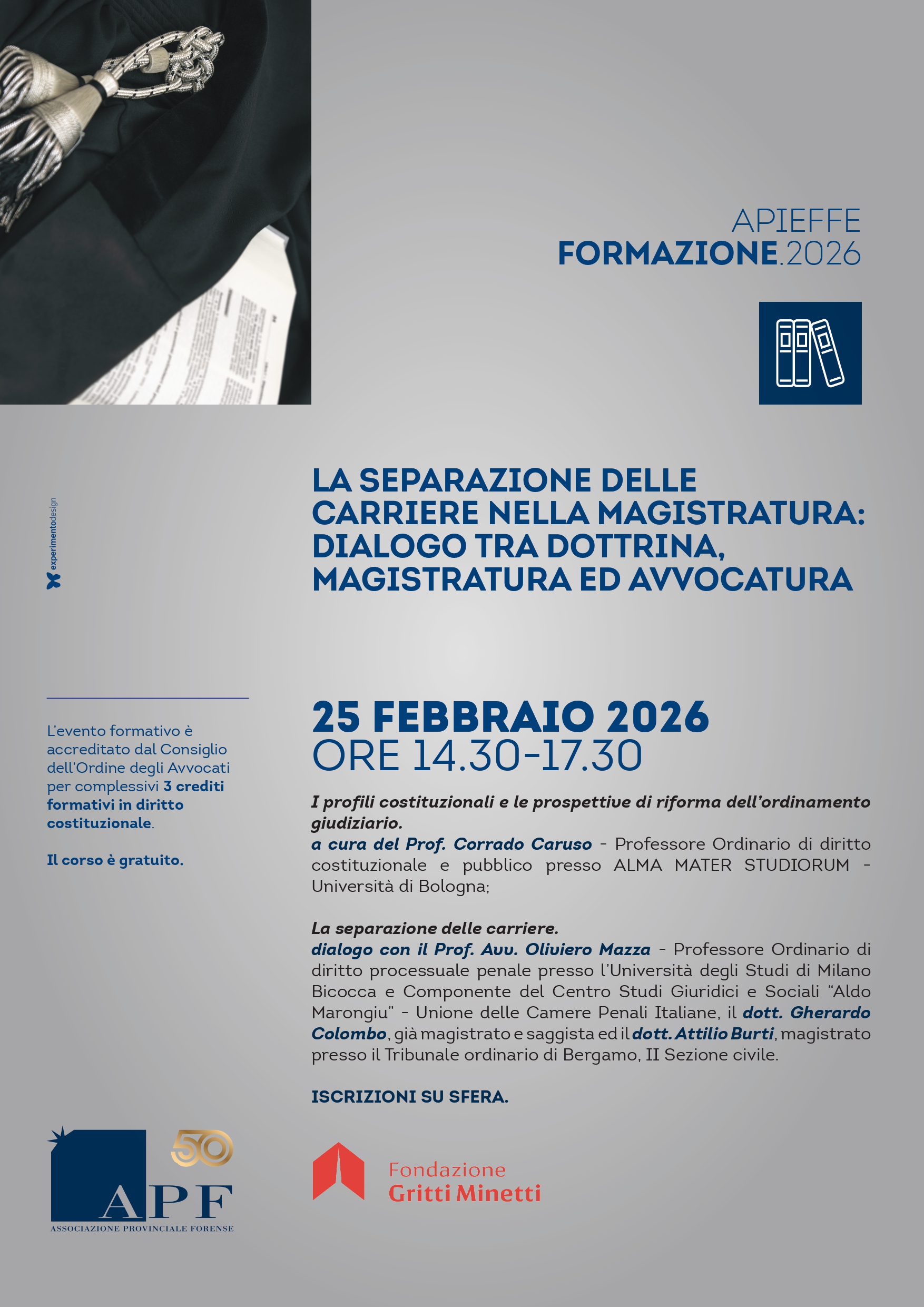 A guidare la riflessione sarà il Prof. Corrado Caruso, Professore Ordinario di diritto costituzionale e pubblico presso l’Alma Mater Studiorum – Università di Bologna, che offrirà una lettura sistemica dei profili costituzionali della separazione delle carriere. Il confronto proseguirà con il Prof. Avv. Oliviero Mazza, Professore Ordinario di diritto processuale penale presso l’Università degli Studi di Milano-Bicocca e componente del Centro Studi Giuridici e Sociali “Aldo Marongiu” dell’Unione delle Camere Penali Italiane, insieme al dott. Gherardo Colombo, già magistrato e saggista, e al dott. Attilio Burti, magistrato presso il Tribunale ordinario di Bergamo – II Sezione civile.