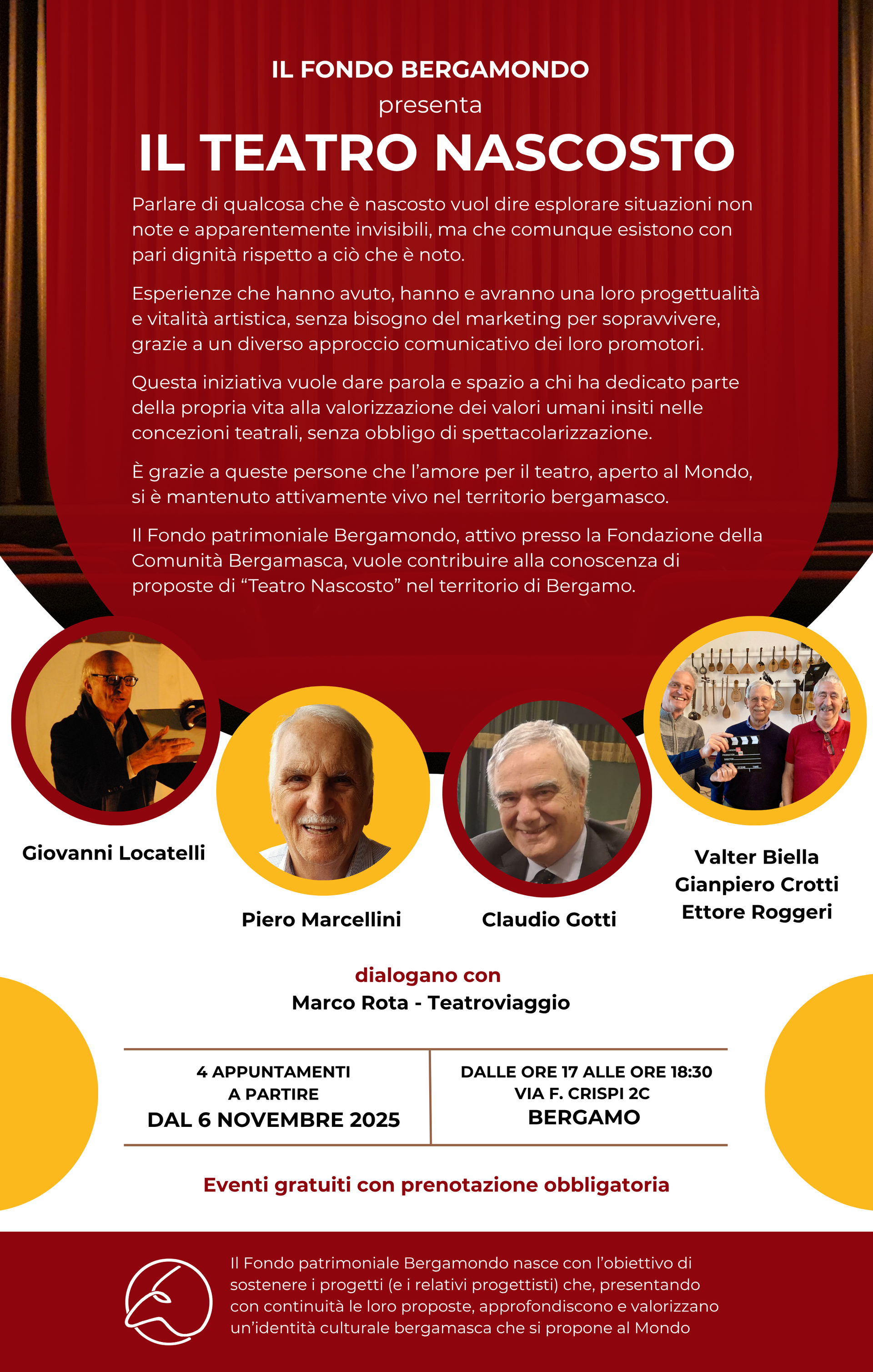 Il Fondo patrimoniale Bergamondo, attivo presso la Fondazione della Comunità Bergamasca, vuole contribuire alla conoscenza di proposte di “Teatro Nascosto” nel territorio di Bergamo.
