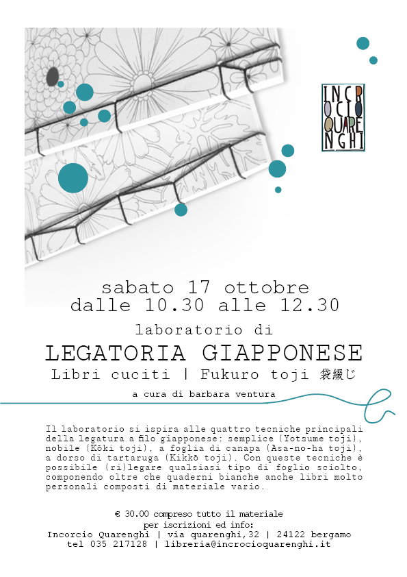Il laboratorio si ispira alle quattro tecniche principali della legatura a filo giapponese: semplice (Yotsume toji), nobile (Kōki toji), a foglia di canapa (Asa-no-ha toji), a dorso di tartaruga (Kikkō toji). Con queste tecniche è possibile (ri)legare qualsiasi tipo di foglio sciolto, componendo oltre che quaderni bianche anche libri molto personali composti di materiale vario.