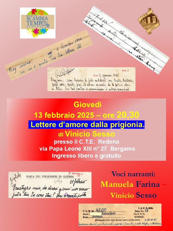 In occasione del giorno di San Valentino, il Centro per tutte le età di Redona è lieto di ospitare Vinicio Sesso, il quale terrà un'interessante conferenza dedicata alle preziose testimonianze scritte dei militari italiani durante la Seconda Guerra Mondiale: le loro lettere."