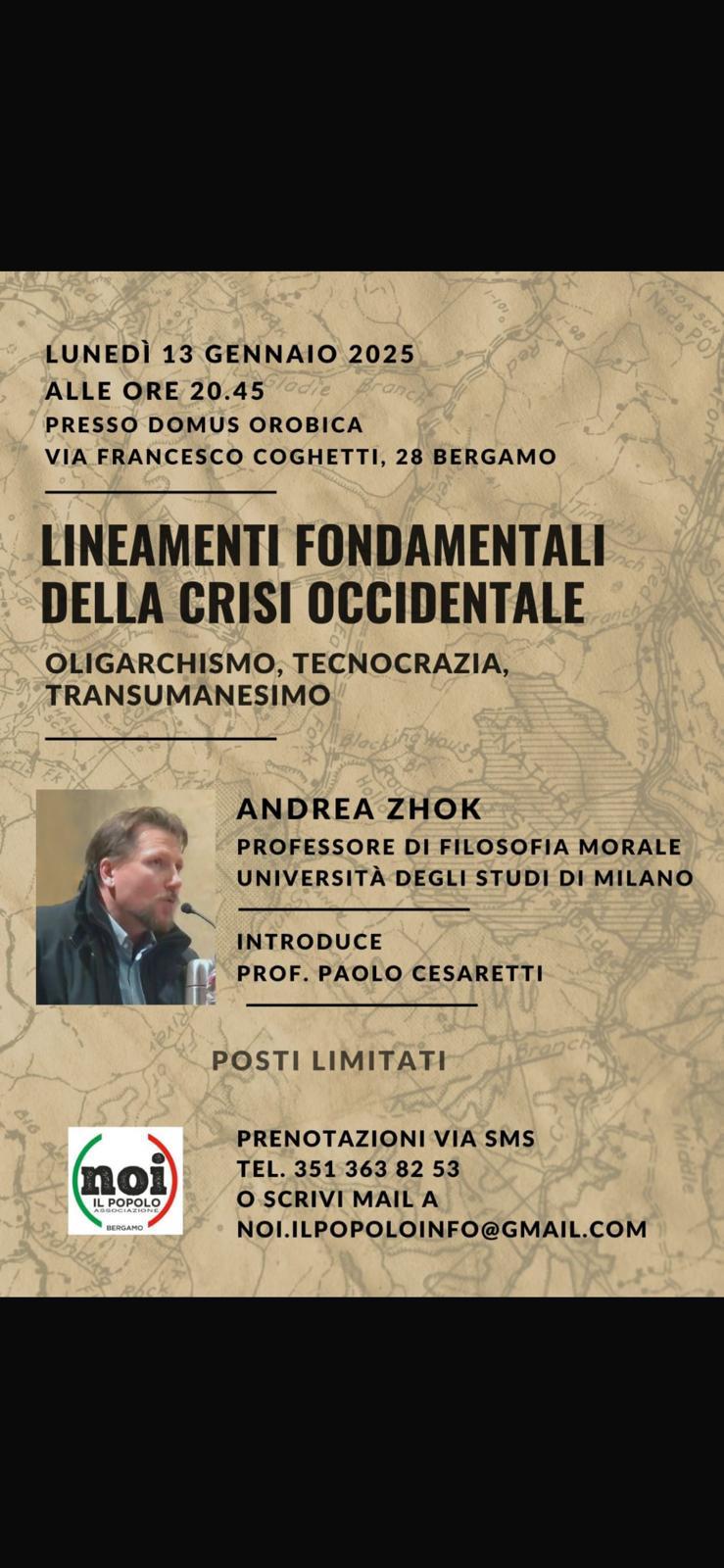 Il professor Andrea Zhok, docente di filosofia morale sarà relatore dell'incontro, per approfondire temi come l'oligarchismo, la tecnocrazia e il transumanesimo, elementi che delineano la crisi occidentale.