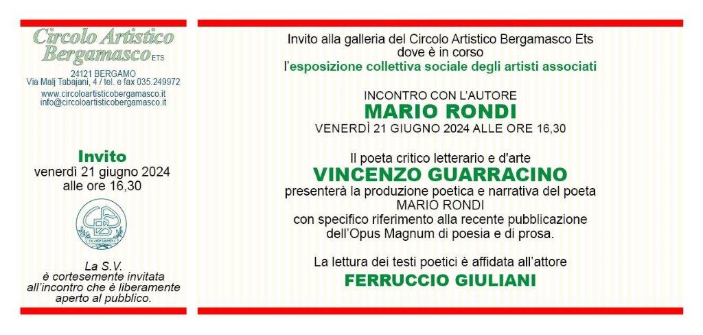 Il poeta critico e letterario d'arte Vincenzo Guarracino presenterà la produzione poetica e narrativa del poeta Mario Rondi con specifico riferimento alla recente pubblicazione dell'Opus Magnum di poesia e di prosa. La lettura dei testi poetici è affidata all'attore Ferruccio Giuliani.