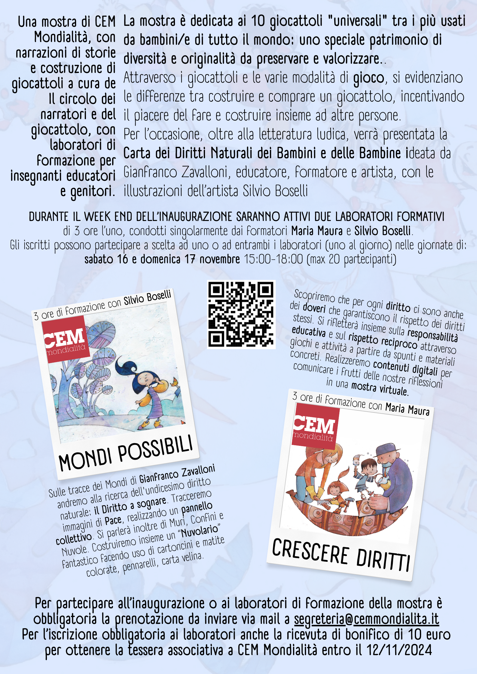 Il laboratorio formativo educativo si svolge su 2 moduli di 3 ore (dalle 15 alle 18) ciascuno per docenti, genitori e operatori educativi, condotto dal formatore artista CEM Silvio Boselli.