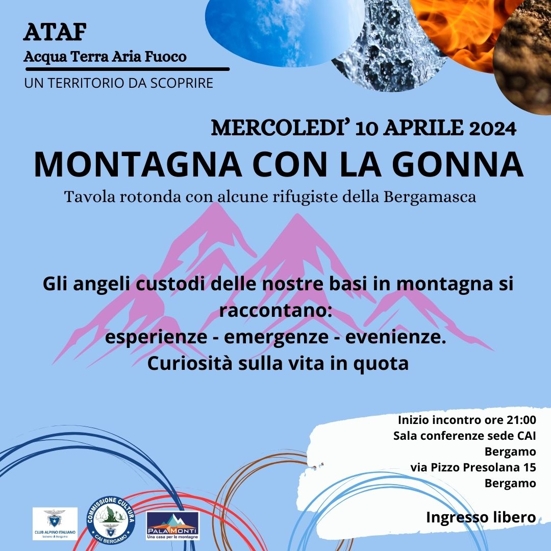 Prosegue la rassegna "ATAF Acqua Terra Aria Fuoco" organizzata dalla Commissione Cultura CAI Bergamo: ospiti alcune rifugiste della Bergamasca.