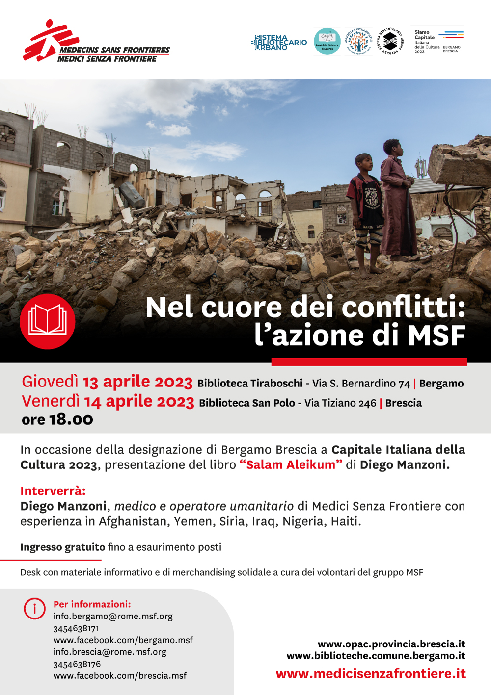 In occasione della designazione di Bergamo Brescia a Capitale Italiana della Cultura 2023, presentazione del libro “Salam Aleikum” di Diego Manzoni, medico e operatore umanitario di Medici Senza Frontiere con esperienza in Afghanistan, Yemen, Siria, Iraq, Nigeria, Haiti.