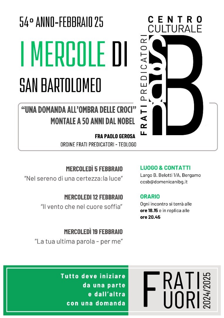 I Mercole di San Bartolomeo vi aspettano! Tre mercoledì dedicati alla riflessione a partire da "Una domanda all'ombra delle croci" - Montale a 50 anni dal Nobel. Un'occasione unica per confrontarsi e crescere insieme.