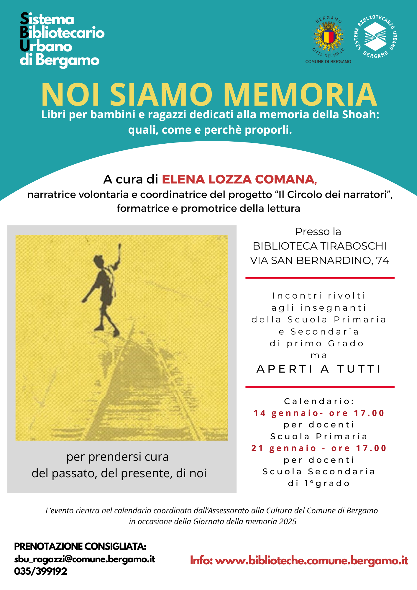 In occasione della Giornata della Memoria il Sistema Bibliotecario Urbano di Bergamo organizza due incontri per adulti con Elena Lozza Comana: una presentazione ragionata di libri per bambini e ragazzi sulla Shoah a cura di Elena Lozza Comana, narratrice volontaria e coordinatrice nel progetto “Il circolo dei narratori”, formatrice e promotrice alla lettura.