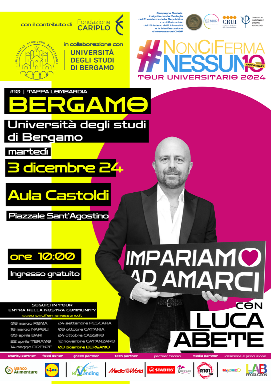 Arriva per la prima volta a Bergamo il tour motivazionale di Luca Abete. I protagonisti dell'incontro saranno gli studenti e le studentesse, coinvolti nel talk. La tappa lombarda conclude la decima edizione del tour.