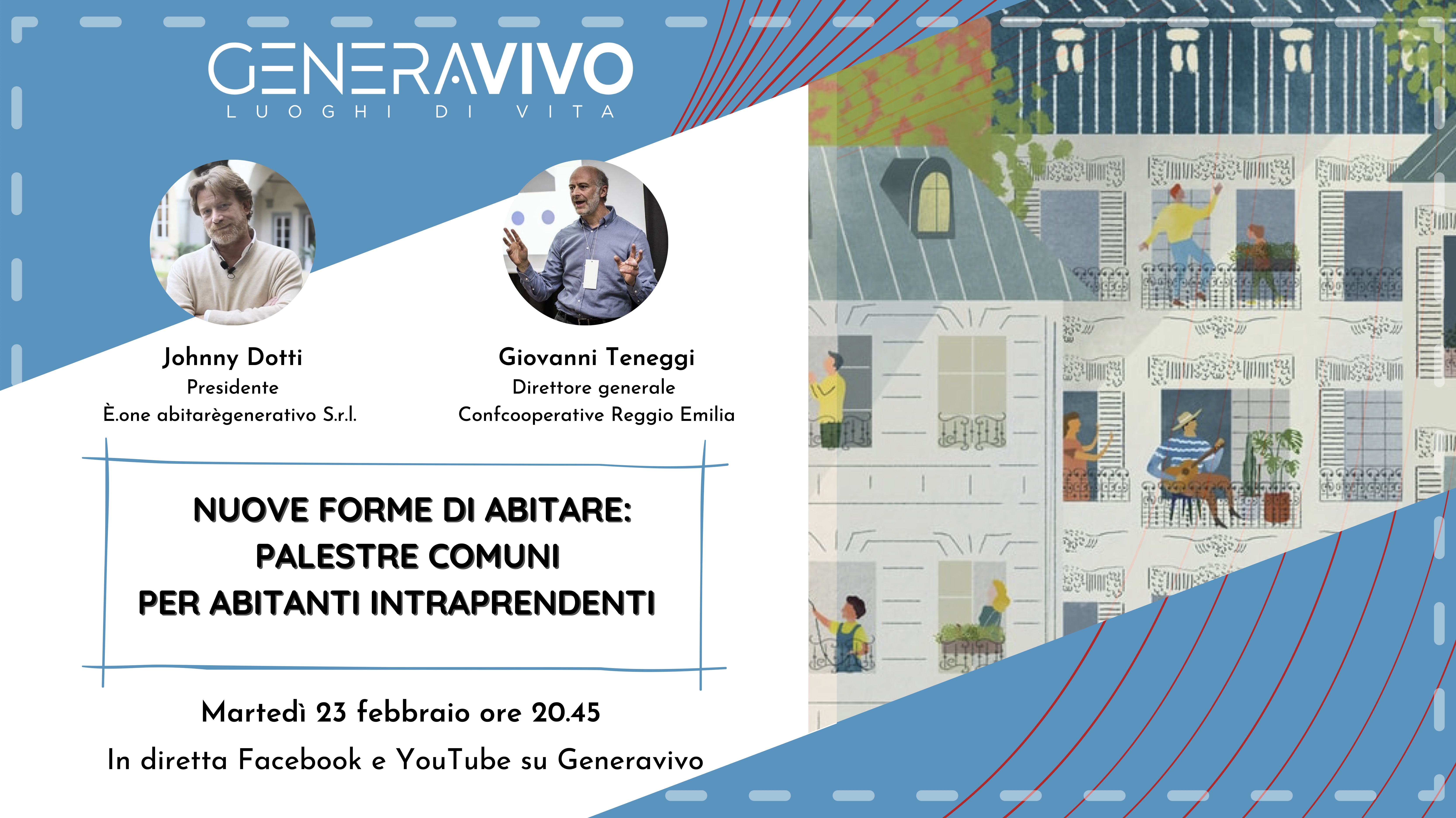 Martedì 23 Febbraio ore 20,45 Johnny Dotti - Presidente di È.one abitarègenerativo S.r.l. e Giovanni Teneggi - Direttore generale di Confcooperative Reggio Emilia dialogheranno sulle nuove forme di abitare la casa, il quartiere, il territorio: palestre per chi vuole co-progettare il futuro.