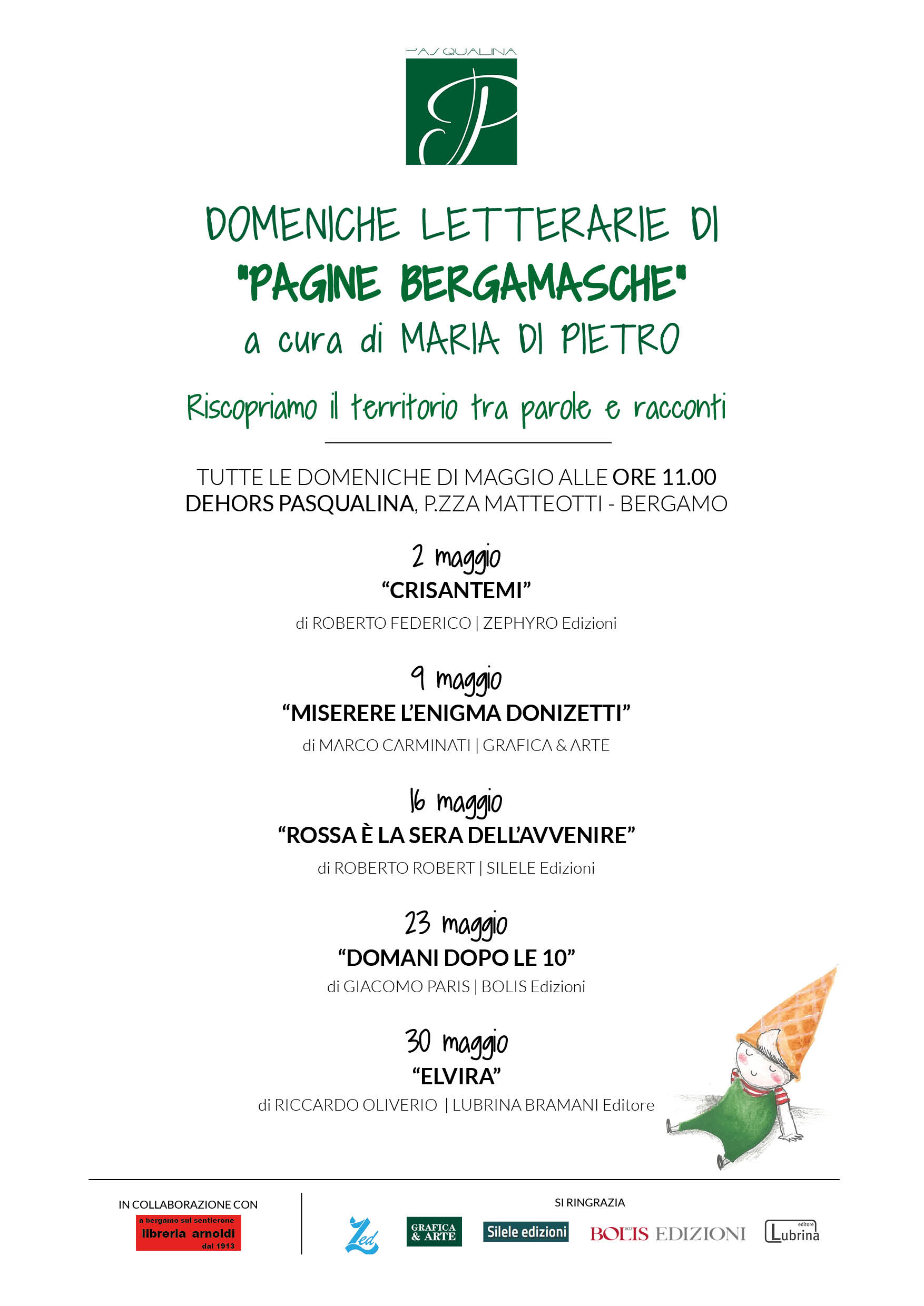 Riscoprire e valorizzare il territorio bergamasco attraverso le voci e le parole di autori ed editori locali: un’iniziativa culturale che Pasqualina – due volte Miglior Bar d’Italia Gambero Rosso – ospiterà tutte le domeniche di maggio, nel dehors di Piazza Matteotti a Bergamo.