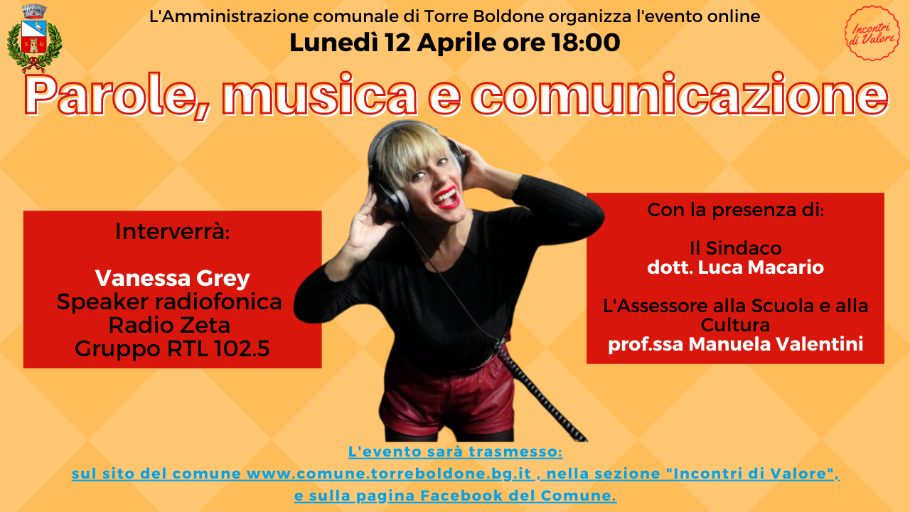 Continuano gli "Incontri di valore" programmati dall'amministrazione comunale di Torre Boldone: questa sera ospite Vanessa Grey di Radio Zeta / Gruppo RTL 102.5.