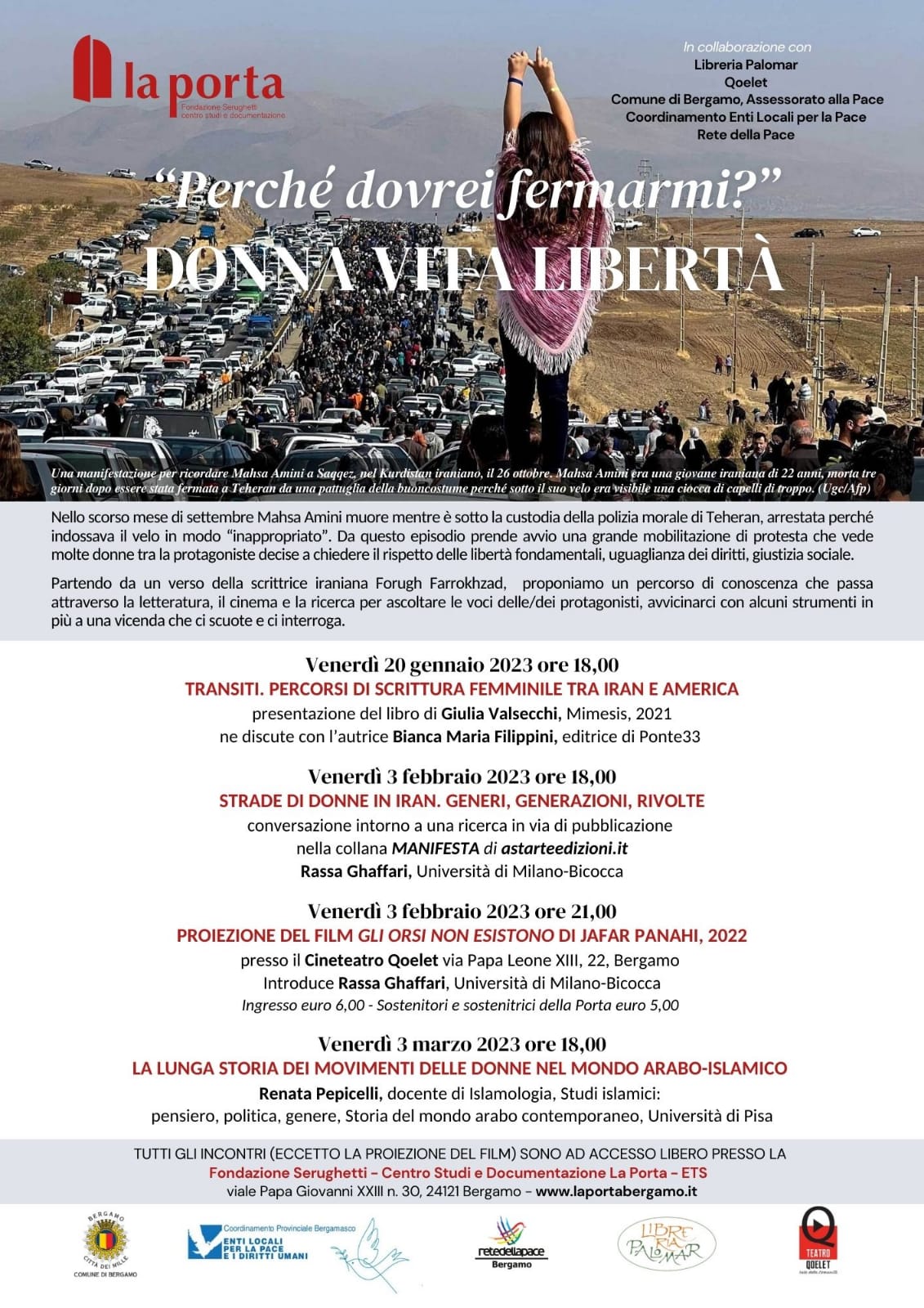 Nello scorso mese di settembre Mahsa Amini muore mentre è sotto la custodia della polizia morale di Teheran, arrestata perchè indossava il velo il modo "inappropriato". Da questo episodio prende avvio una grande mobilitazione di protesta che vede molte donne tra le protagoniste decise a chiedere il rispetto delle libertà fondamentali, uguaglianza dei diritti, giustizia sociale.