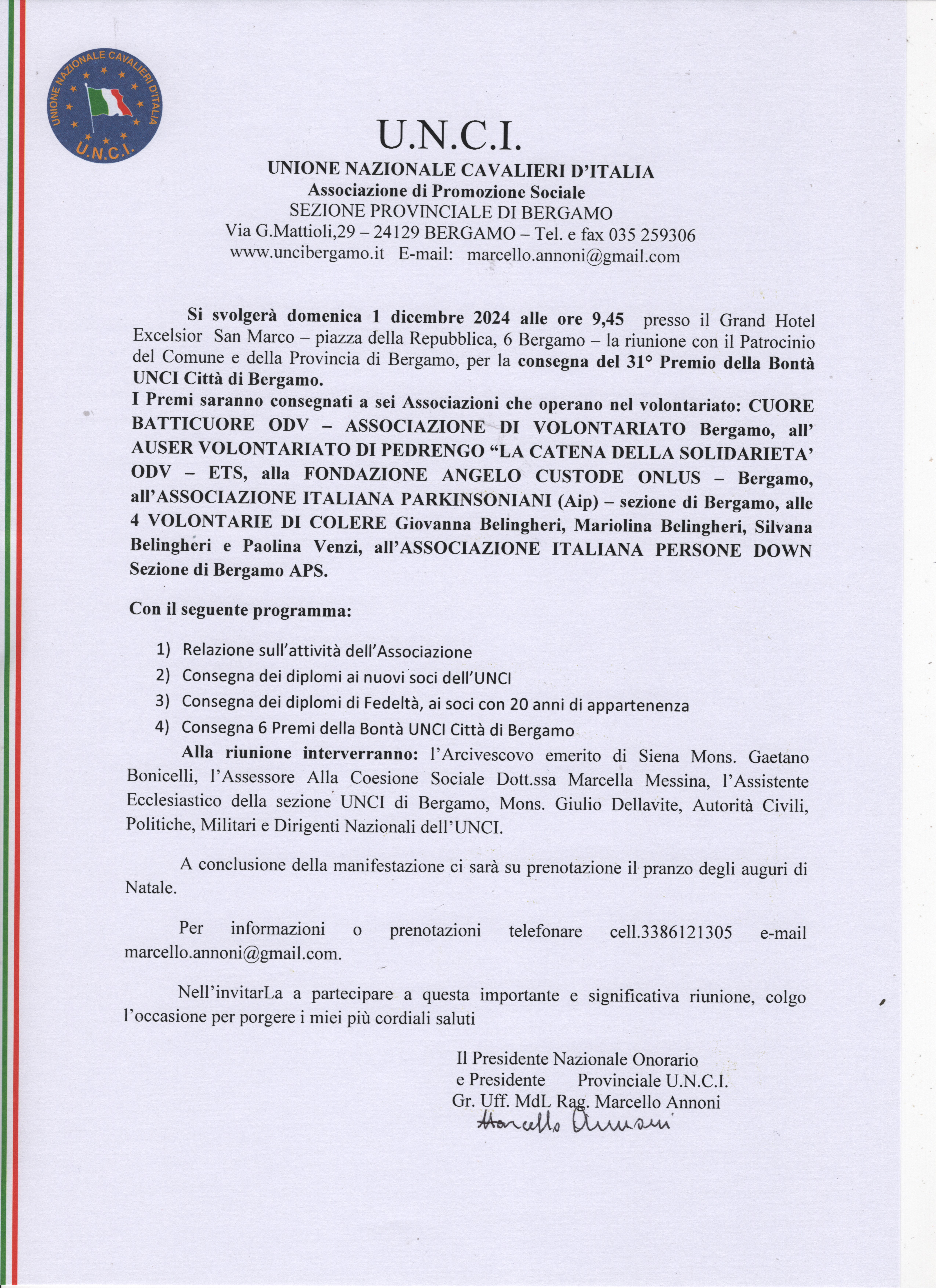 Si svolgerà domenica 1 dicembre 2024 alle ore 9,45 presso il Grand Hotel Excelsior San Marco la riunione con il Patrocinio del Comune e della Provincia di Bergamo, per la consegna del 31° Premio della Bontà UNCI Città di Bergamo.