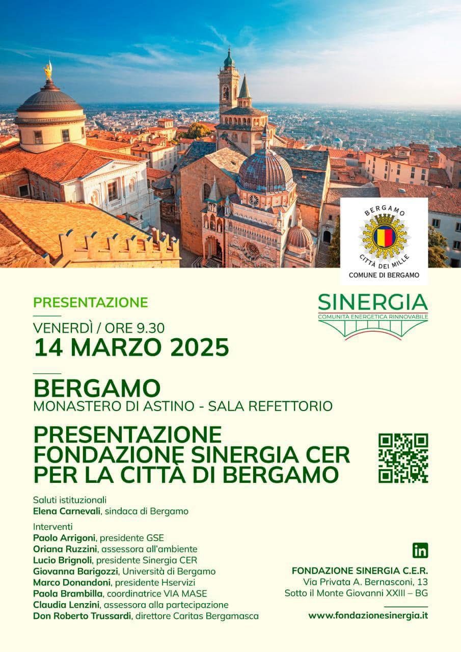 Venerdì 14 marzo, dalle ore 9:30 alle 13, presso il Monastero di Astino, nella sala refettorio, si terrà la presentazione ufficiale della Fondazione Sinergia CER, la comunità energetica di Bergamo. L’iniziativa vedrà la partecipazione di importanti rappresentanti istituzionali e del mondo accademico e sociale. Tra i presenti ci sarà Paolo Arrigoni, presidente del Gestore dei Servizi Energetici (GSE), che porterà il suo contributo all’incontro.