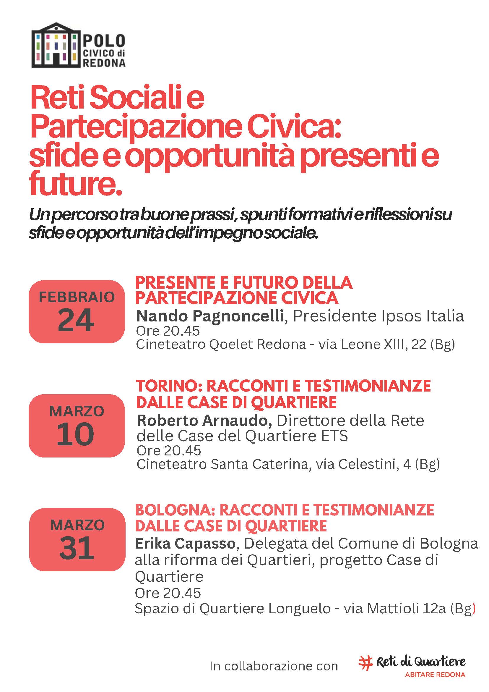 Il Polo Civico di Redona, quartiere di Bergamo, in collaborazione con la Rete di quartiere di Redona, propone un percorso di riflessione sulla partecipazione civica in tre appuntamenti sul territorio.