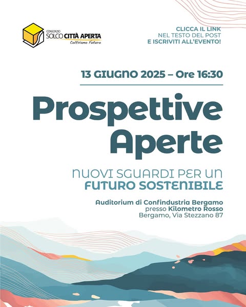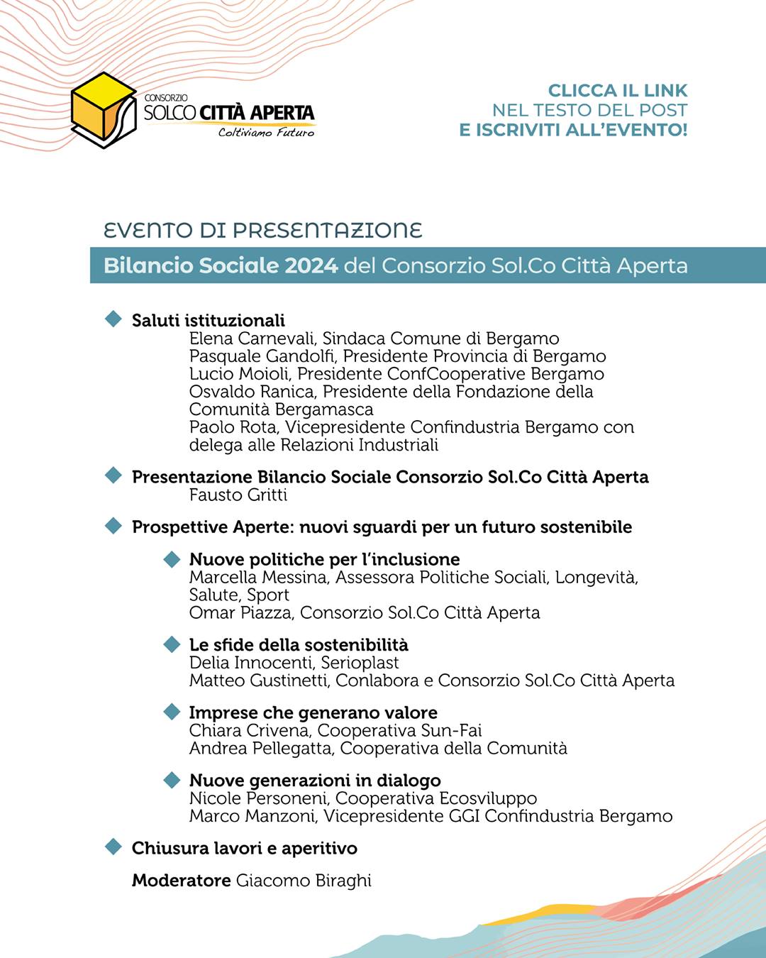 Il 13 giugno alle ore 16.30 si terrà un evento dedicato alla presentazione del Bilancio Sociale 2024 del Consorzio Sol.Co Città Aperta. L'incontro avrà luogo presso l’Auditorium di Confindustria Bergamo, all’interno del Kilometro Rosso.