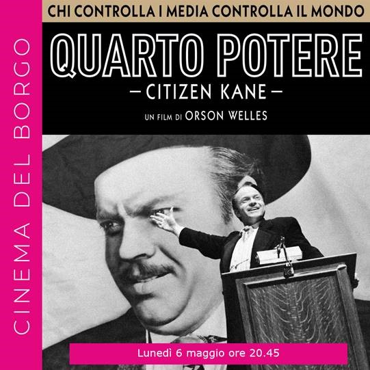 In occasione dellโanniversario della nascita di Orson Welles (6 maggio 1915) ci sarร la proiezione del film "Quarto Potere" presso il Cinema del Borgo.
