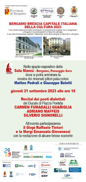Lo spazio espositivo della Sala Manzù ospita i poeti dialettali del Ducato di Piazza Pontida Carmen Fumagalli Guariglia, Adriano Maffeis e Silverio Signorelli per un incontro poetico. All’evento parteciperanno con la recitazione di alcune briose scenette il Giopì Raffaele Tintori e la Margì Emanuela Giovanessi.
