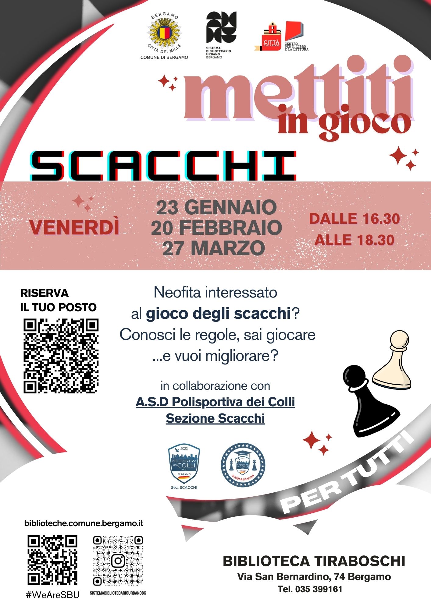 Un'occasione per chi gioca a scacchi per la prima volta e a chi giร conosce le regole e vuole migliorare: i partecipanti saranno guidati da un esperto di ASD Polisportiva dei Colli sezione scacchi.