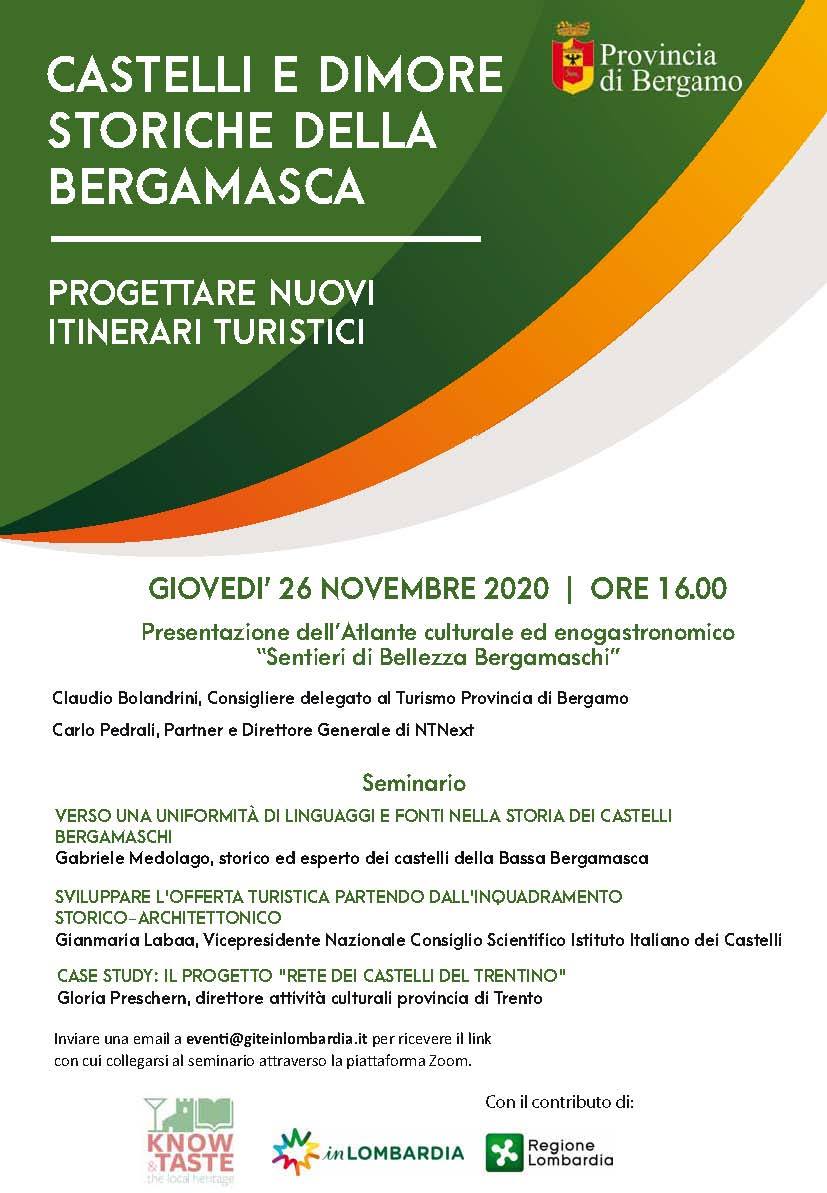 Il webinar si intitola “Castelli e dimore storiche della Bergamasca – Progetti e nuovi itinerari turistici. Durante il seminario verrà presentato l’Atlante culturale ed enogastrononico “Sentieri di Bellezza Bergamaschi", realizzato dalla Provincia sempre grazie al finanziamento regionale: un volume che raccoglie suggestive descrizioni e itinerari culturali legati ai castelli e alle dimore storiche del territorio.