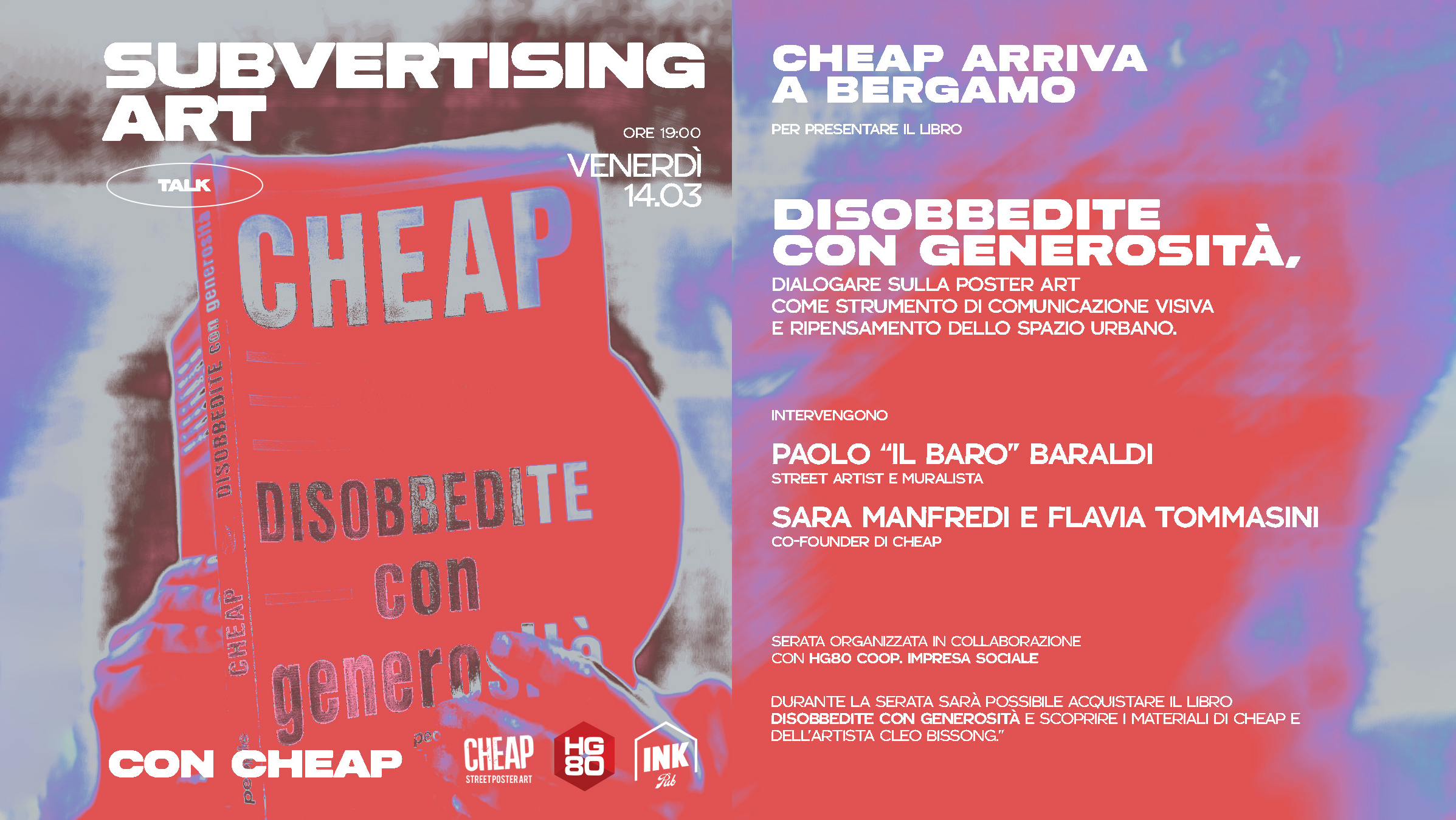 Una serata tra arte, attivismo e spazio pubblico. Una serata dedicata all’arte pubblica e al subvertising, presentando Disobbedite con generosità, il libro del collettivo di street poster art CHEAP.