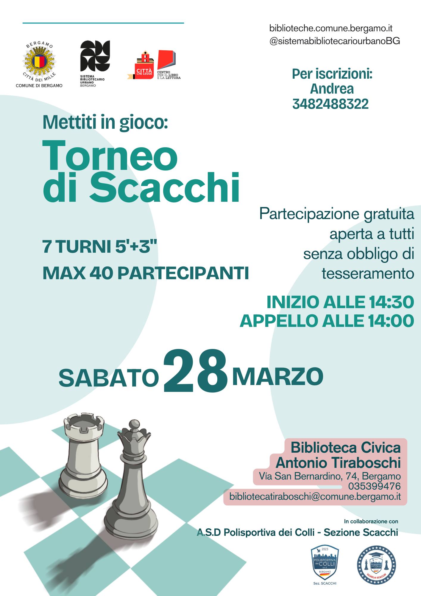 La Polisportiva dei Colli - Sezione SCACCHI in collaborazione con il Sistema Bibliotecario Urbano organizza un torneo di scacchi in Sala Mimmo Boninelli.